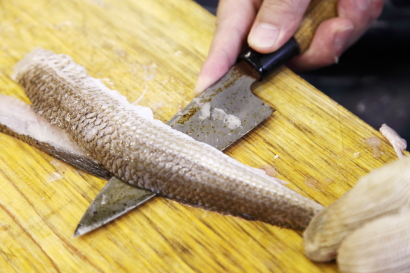 煉 り 当店では、かまぼこの生地「すり身」を造るのに、御影石の臼(うす)と専用の杵(きね)を使って煉り上げていく製法を、創業より代々守り続けています。