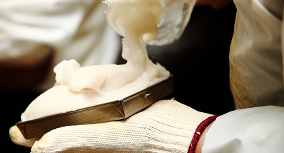出来上がった「すり身」を職人が専用のヘラで、11センチ角の型にピラミッド型のように一枚一枚丁寧に成型していきます。