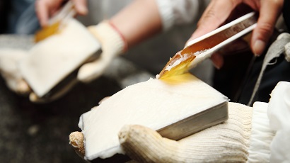 一見、簡単な作業に見えますが「すり身」は軟らかいのできめ細かい職人の技が必要です。近年、機械化が進んでいく中で当店では、専用の「焼型」に一枚一枚手造りで成型していく昔ながらの製法を今日も守り続けています。 |