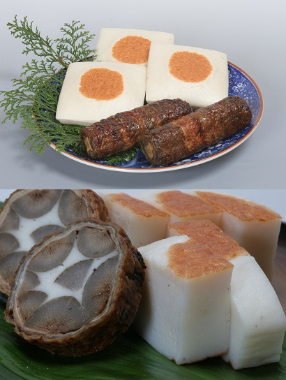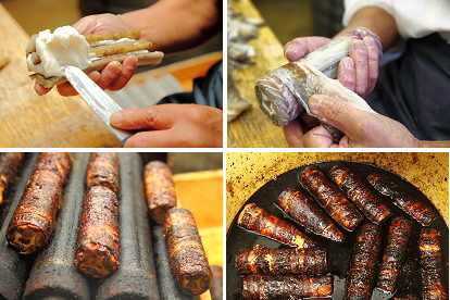 当店では国産の軟らかく煮込んだごぼうと魚のすり身を職人が一本一本手で成形をします。これの外周に当店で加工した魚の皮を巻きつけて専用のオーブンにて当店秘伝の「タレ」に浸してじっくりと焼き上げています。使用する魚の皮は(加工時に小さい魚も含まれており)頭・尾びれを除いて外周を巻きつけられるもののみ使用しますので、製造が限られております。単品のみでのご注文についてはお控えいただくようお願い申し上げます。 |